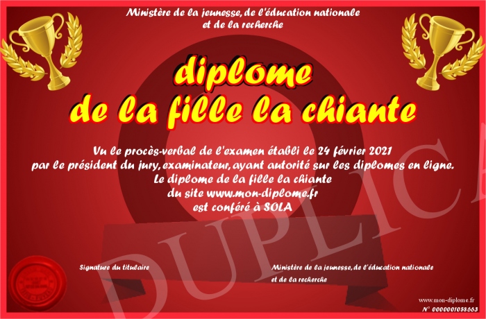 Envoyez par email votre diplome de la fille la chiante personalisé