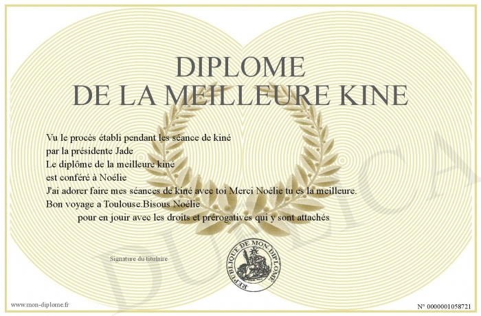 Envoyez par email votre Diplôme de la meilleure kiné personalisé
