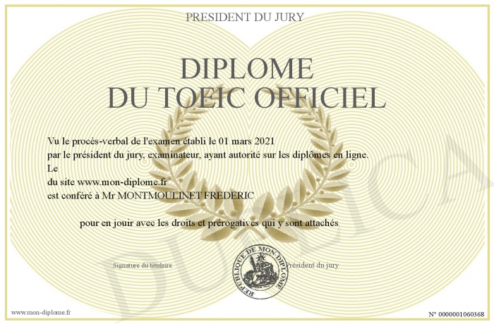 Envoyez par email votre Diplôme du TOEIC officiel personalisé
