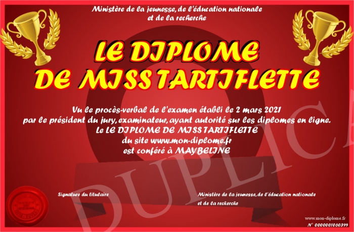 Envoyez par email votre LE DIPLOME DE MISS TARTIFLETTE personalisé