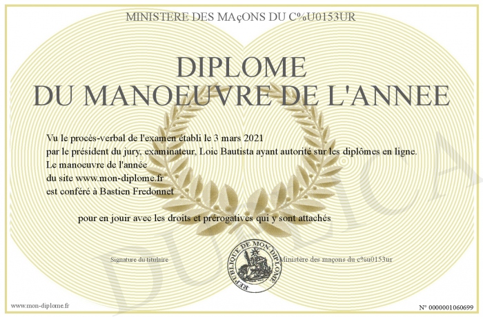 Envoyez par email votre Diplôme du manoeuvre de l'année personalisé
