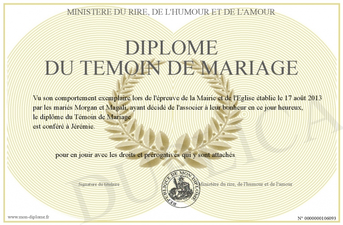 Envoyez par email votre Diplôme du Témoin de Mariage personalisé