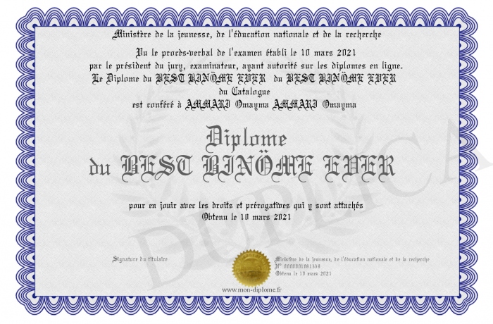 Envoyez par email votre Diplôme du BEST BINÖME EVER personalisé