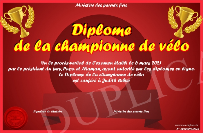 Envoyez par email votre Diplôme de la championne de vélo personalisé