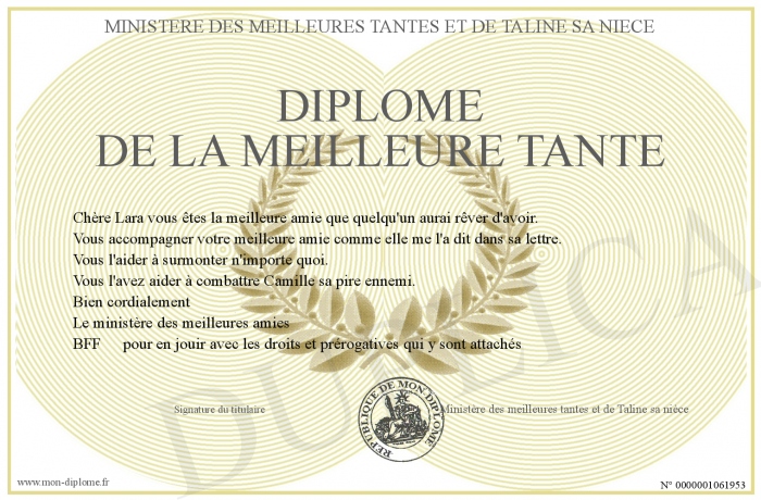 Envoyez par email votre Diplôme de la meilleure tante personalisé