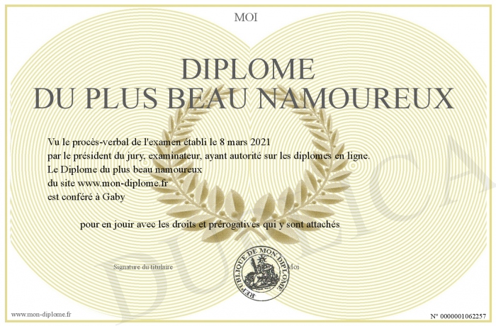 Envoyez par email votre Diplôme du plus beau namoureux personalisé