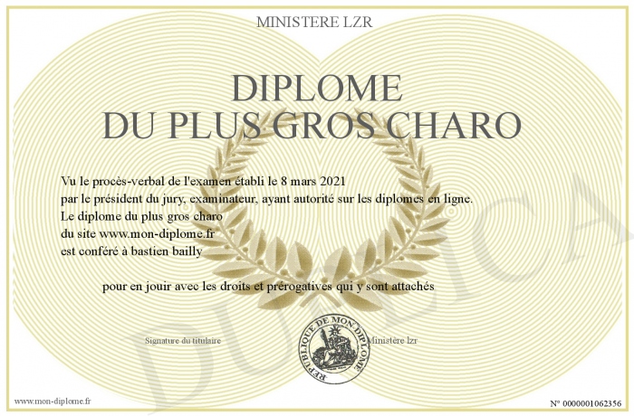Envoyez par email votre diplôme du plus gros charo personalisé
