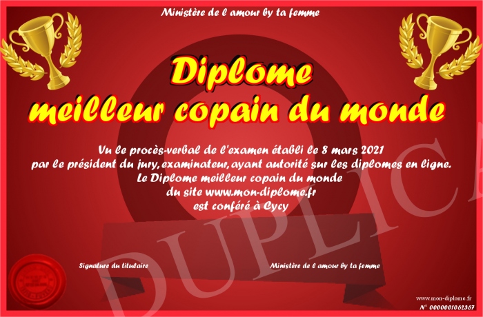 Envoyez par email votre Diplôme meilleur copain du monde personalisé