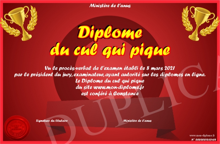 Envoyez par email votre Diplôme du cul qui pique personalisé