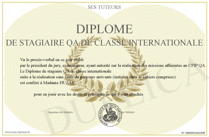 Envoyez par email votre Diplôme de stagiaire QA de classe internationale personalisé