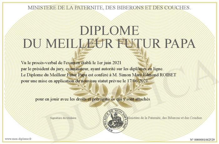 Envoyez par email votre Diplôme du Meilleur Futur Papa personalisé