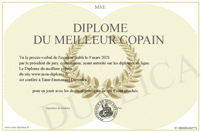 Envoyez par email votre Diplôme du meilleur copain personalisé