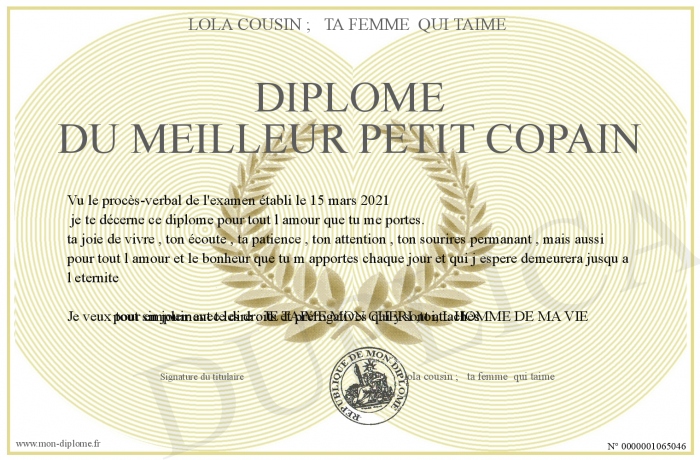 Envoyez par email votre Diplôme du meilleur petit copain personalisé