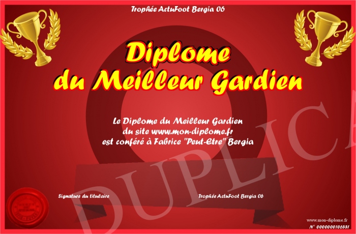 Envoyez par email votre Diplôme du Meilleur Gardien personalisé