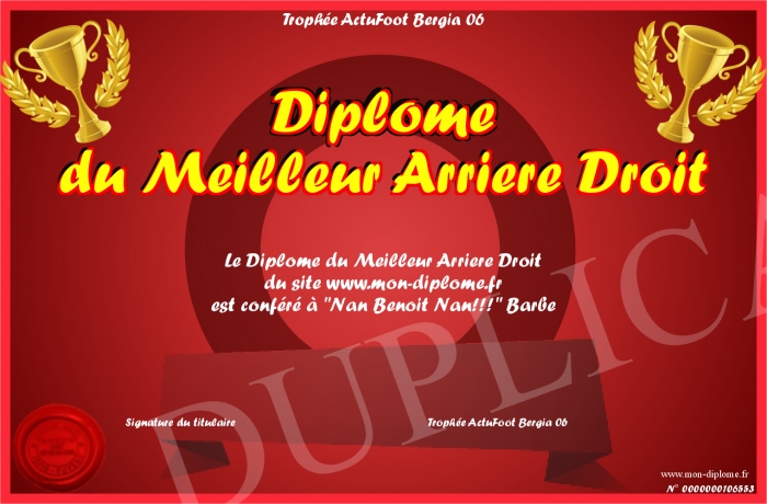 Envoyez par email votre Diplome du Meilleur Arriere Droit personalisé