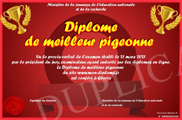 Envoyez par email votre Diplôme de meilleur pigeonne personalisé