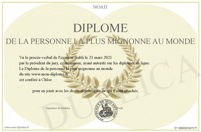 Envoyez par email votre Diplôme de la personne la plus mignonne au monde personalisé
