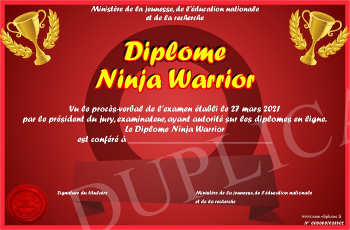 Envoyez par email votre Diplôme Ninja Warrior personalisé