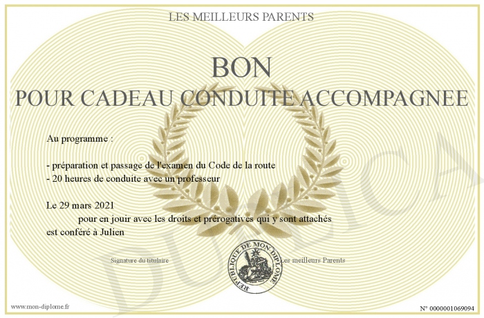 Envoyez par email votre Bon pour cadeau Conduite accompagnée personalisé