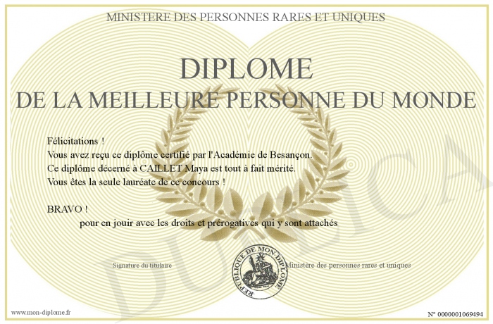 Envoyez par email votre Diplôme de la meilleure personne du monde personalisé