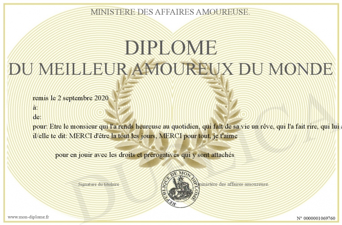 Envoyez par email votre Diplôme du meilleur amoureux du monde personalisé