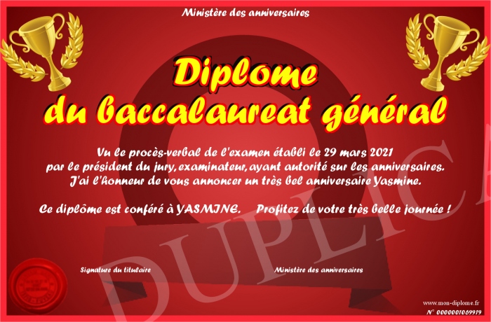 Envoyez par email votre Diplôme du baccalaureat général personalisé