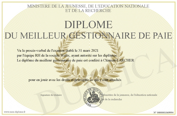 Envoyez par email votre Diplôme du meilleur gestionnaire de paie personalisé