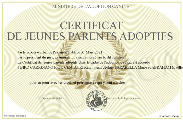Envoyez par email votre Certificat de jeunes parents adoptifs personalisé