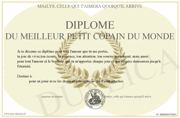 Envoyez par email votre diplome du meilleur petit copain du monde personalisé