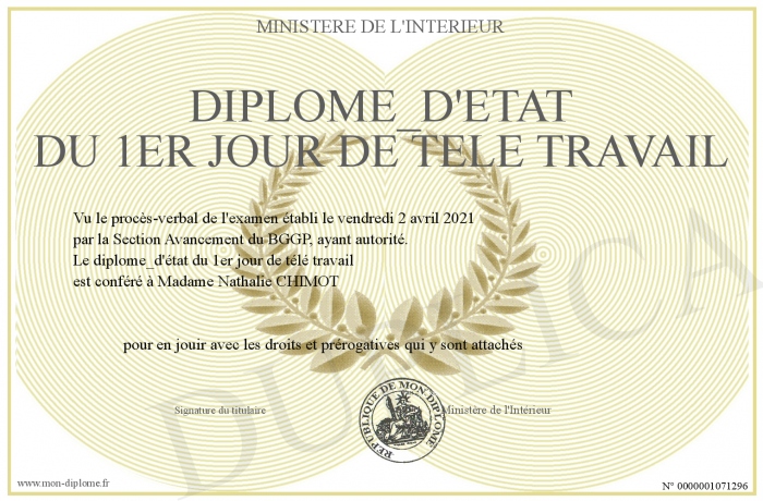 Envoyez par email votre diplôme_d'état du 1er jour de télé travail personalisé