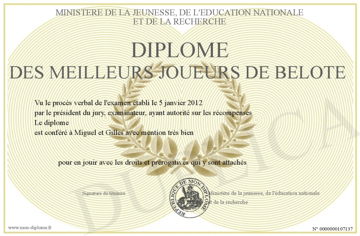 Envoyez par email votre Diplôme des Meilleurs Joueurs de BELOTE personalisé