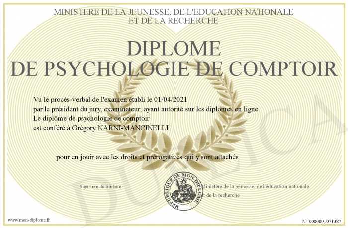 Envoyez par email votre Diplôme de psychologie de comptoir personalisé