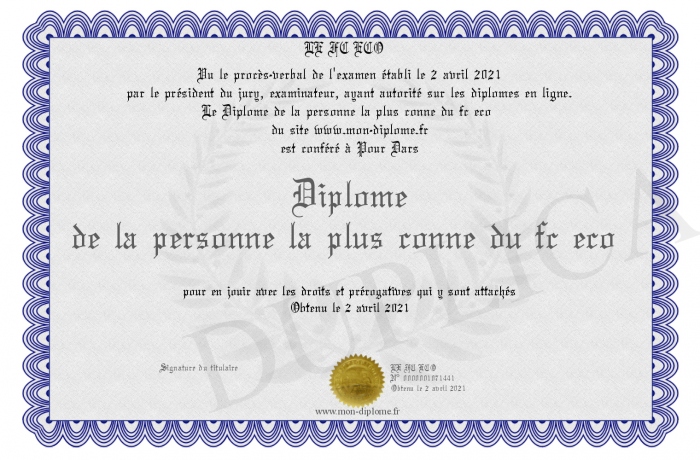 Envoyez par email votre Diplôme de la personne la plus conne du fc eco personalisé