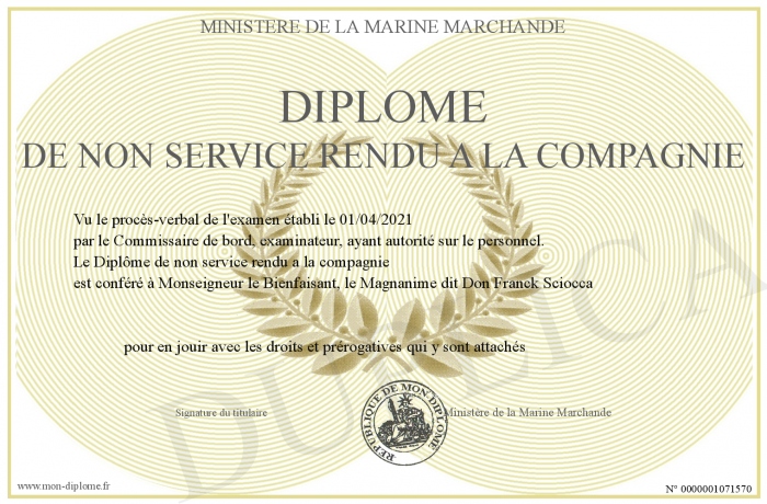 Envoyez par email votre Diplôme de non service rendu a la compagnie personalisé