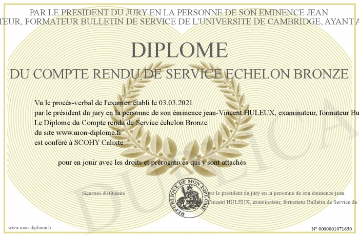 envoyé par le par le président du jury en la personne de son éminence jean-Vincent HULEUX, examinateur, formateur Bulletin de Service de l'université de Cambridge, ayant autorité sur les diplômes. !