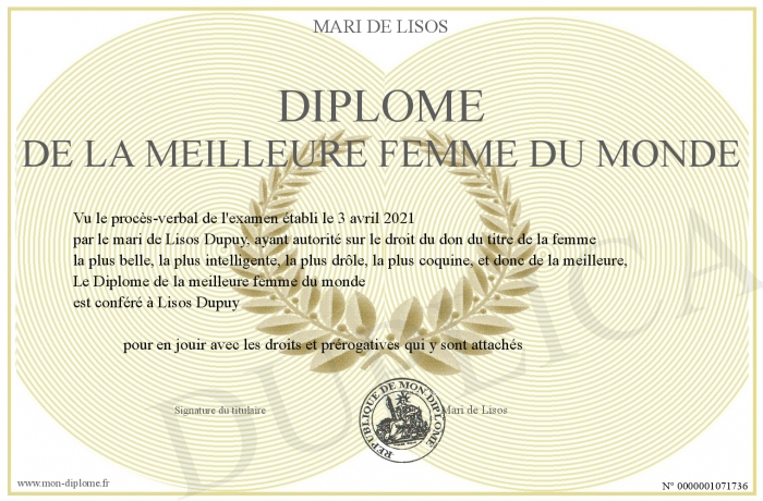 Envoyez par email votre Diplôme de la meilleure femme du monde personalisé