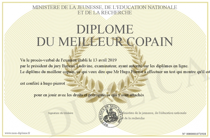 Envoyez par email votre diplôme du meilleur copain personalisé