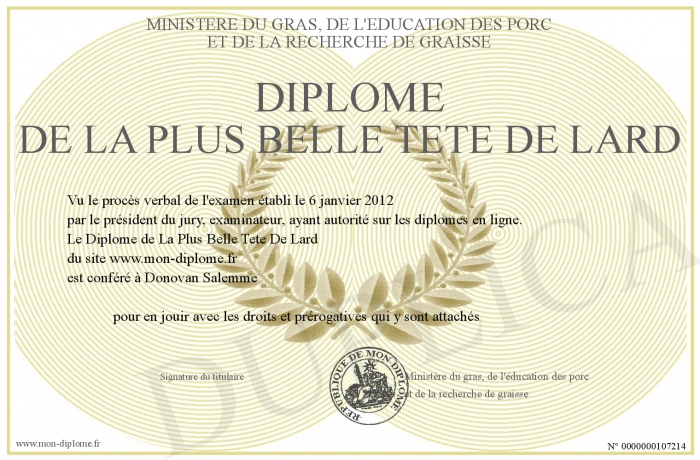 Envoyez par email votre Diplôme de La Plus Belle Tete De Lard personalisé