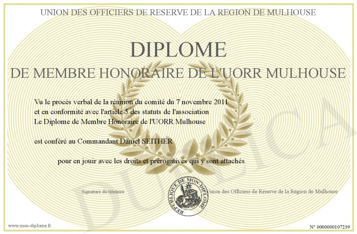 Envoyez par email votre Diplôme de Membre Honoraire de l'UORR Mulhouse personalisé