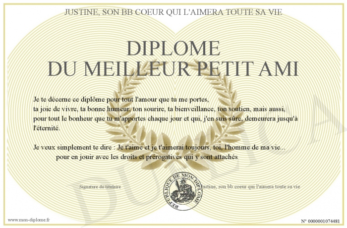 Envoyez par email votre Diplôme du meilleur petit ami personalisé