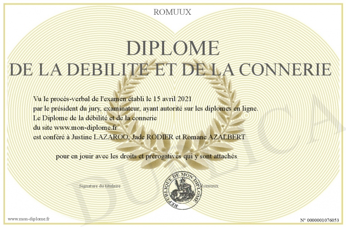 Envoyez par email votre Diplôme de la débilité et de la connerie personalisé