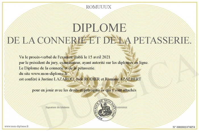 Envoyez par email votre Diplôme de la connerie et de la pétasserie. personalisé