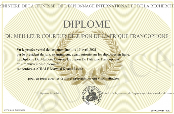 Envoyez par email votre Diplôme Du Meilleur Coureur De Jupon De l'Afrique Francophone personalisé
