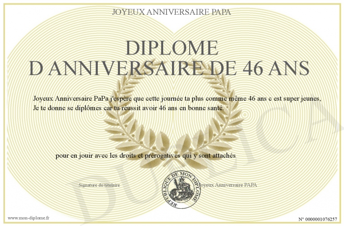Envoyez par email votre Diplôme d anniversaire de 46 ans personalisé