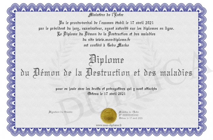 Envoyez par email votre Diplôme du Démon de la Destruction et des maladies personalisé