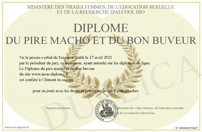 Envoyez par email votre Diplôme du pire macho et du bon buveur personalisé