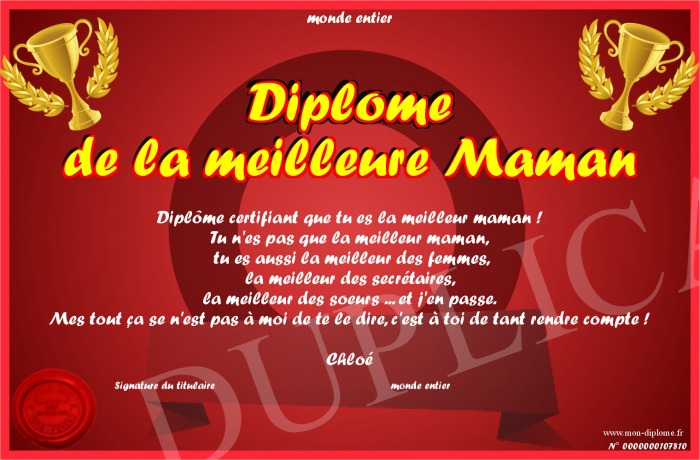 Envoyez par email votre Diplome de la meilleure Maman personalisé