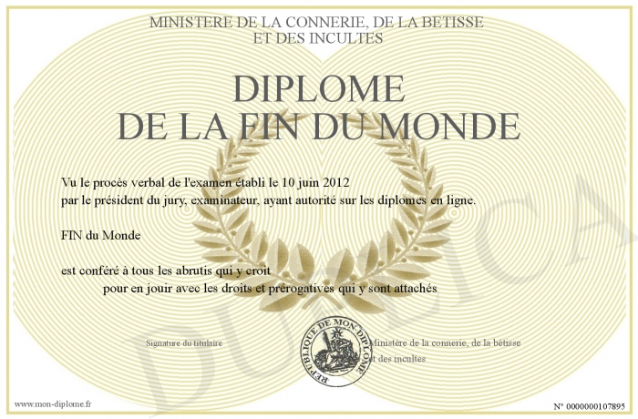 Envoyez par email votre Diplôme de la FIN du MONDE personalisé