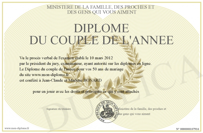 Envoyez par email votre Diplôme du couple de l'année personalisé