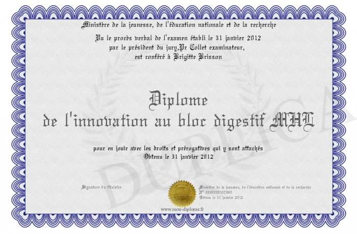 Envoyez par email votre Diplôme de l'innovation au bloc digestif MHL personalisé